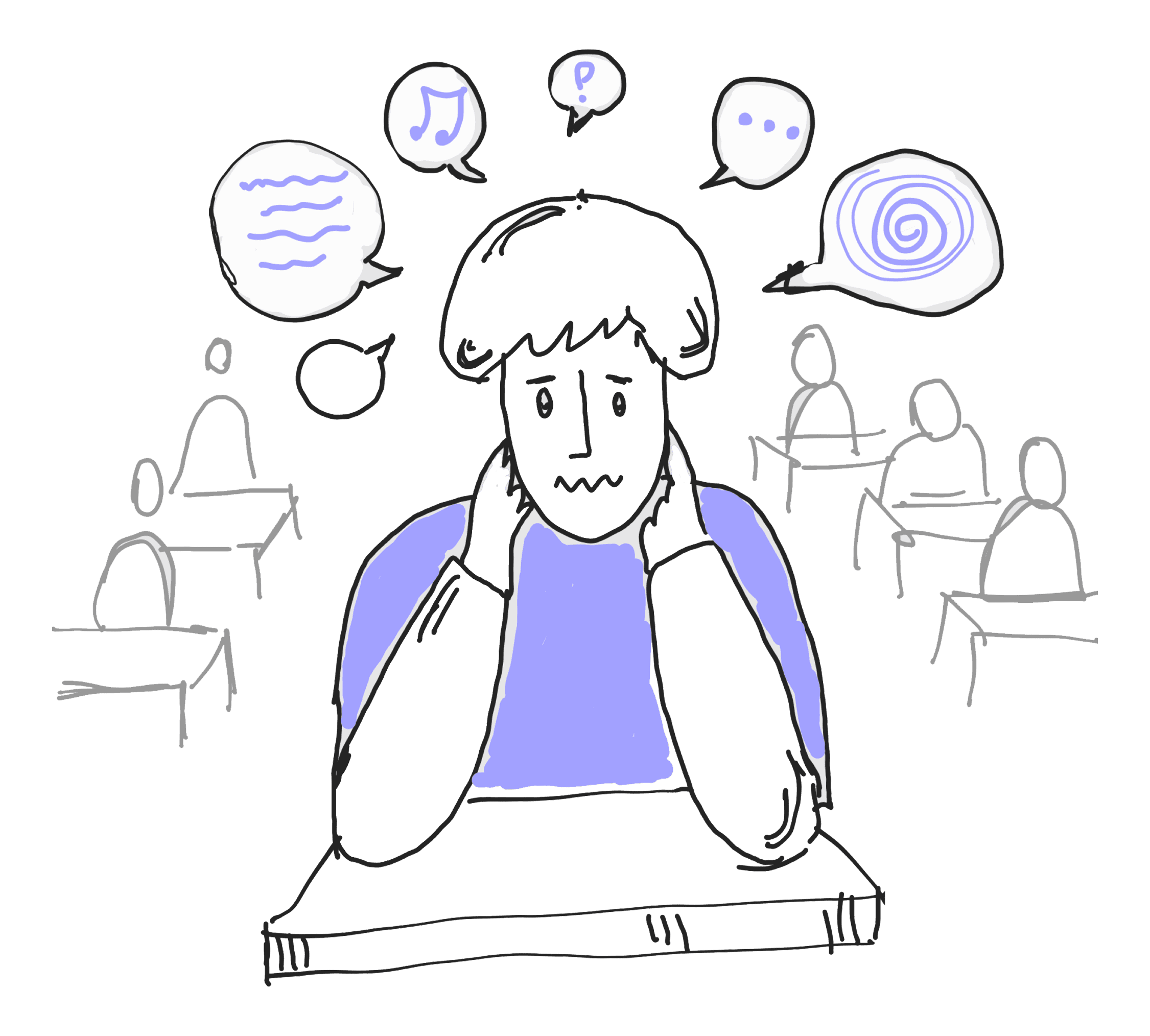 Sometimes, the noise from other students distracts him so much that he gets frustrated and thinks,