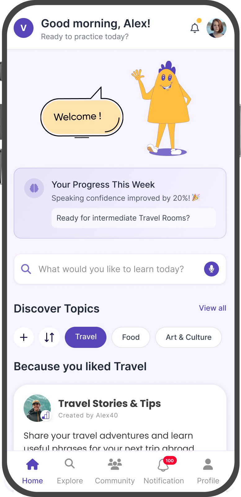 One of the biggest challenges we tackled was giving learners a safe space to chat without shame or embarrassment, at their own level, while still getting support from more advanced or native speakers. Every design decision was shaped by real user feedback, not assumptions, so the product truly reflects how people want to learn.