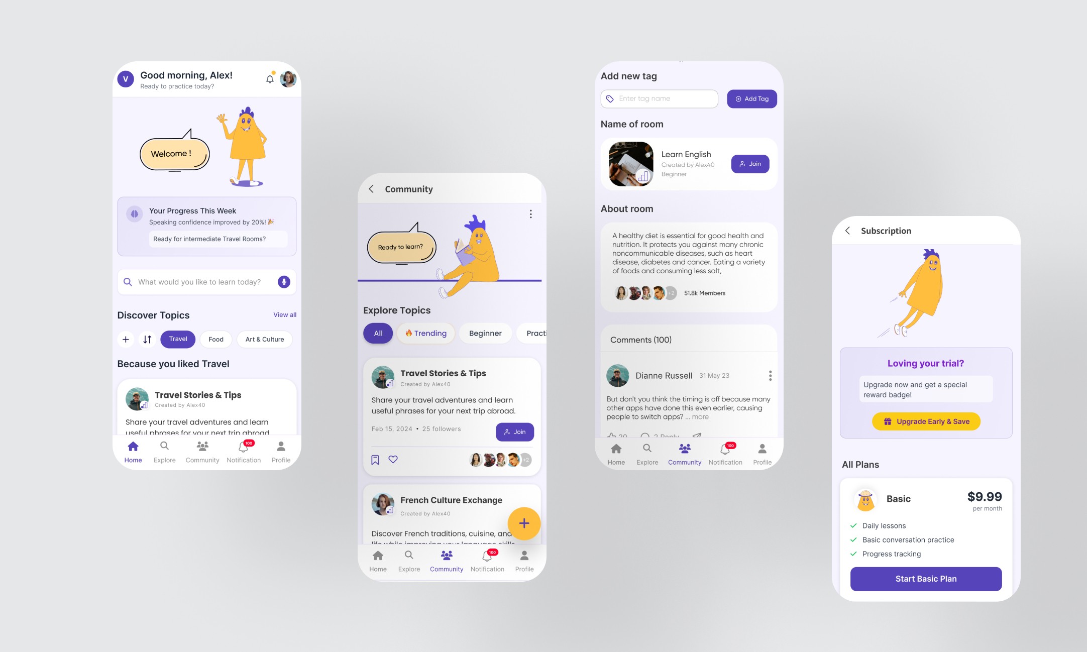 A mobile application redesigned to help language learners stay committed, connected, and confident in their practice. The goal was to foster consistent learning through community interaction, flexible exercises, and a supportive, shame-free environment.