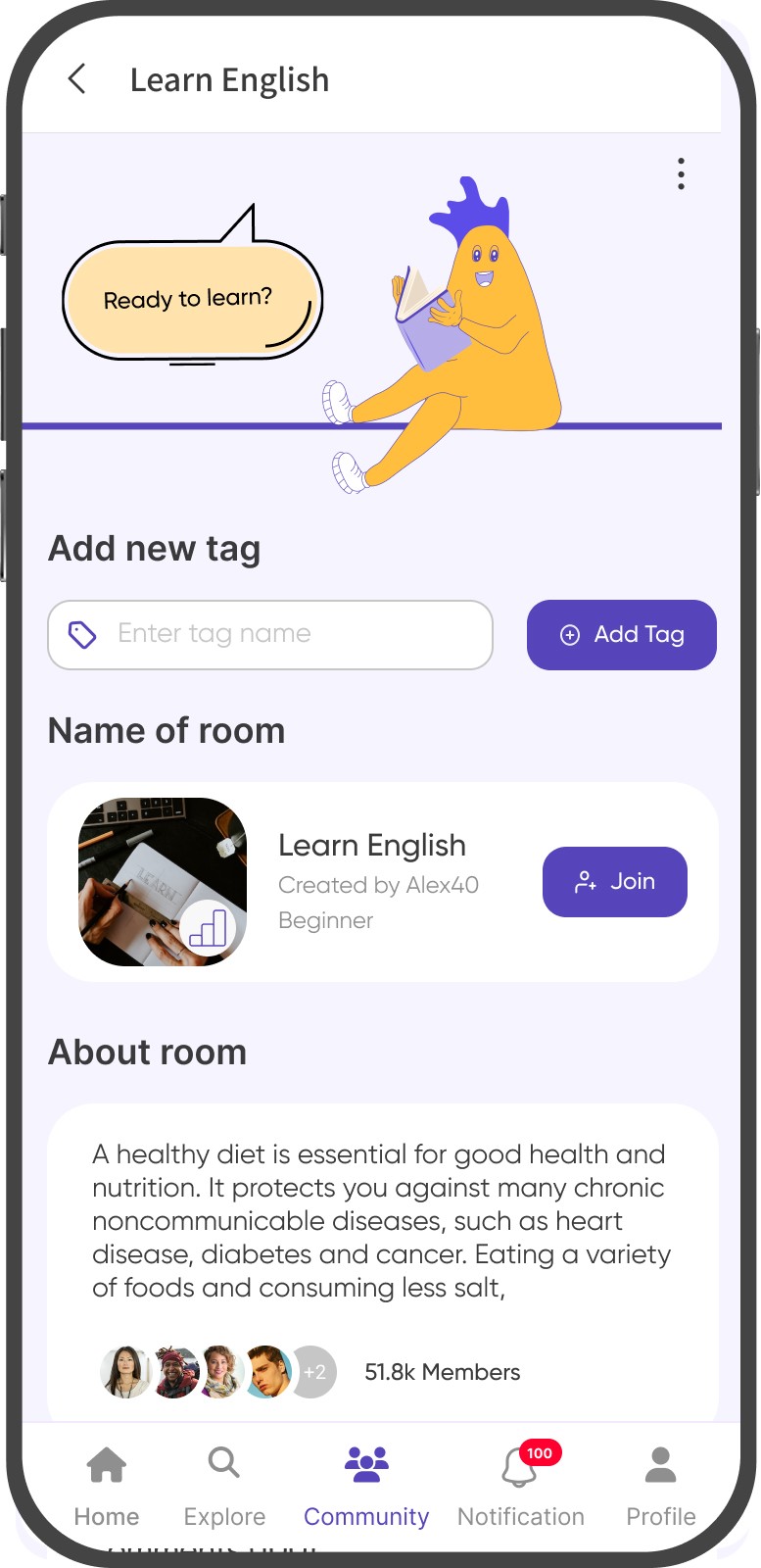 We introduced a tagging system that makes it easy to filter and explore rooms based on specific interests or goals, helping learners connect with more meaningful conversations. In addition, a bookmark page allows users to save and organise rooms by tags, so they can quickly return to the topics that matter most to them.